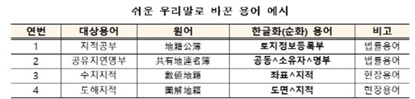 [¾ÆÀ¯°æÁ¦=¹Úâ¿í ±âÀÚ] ±¹Åä±³ÅëºÎ(Àå°ü ¹Ú»ó¿ì¤ýÀÌÇÏ ±¹ÅäºÎ)´Â ÀÏÁ¦°­Á¡±â¿¡ µµÀÔµÈ ÁöÀû(ò¢îß) ºÐ¾ßÀÇ ¾î·Á¿î Àü¹®¿ë¾î¸¦ ¿ì¸®¸»·Î ¹Ù²Ù±â·Î Çß´Ù. ÀÌ´Þ 3ÀÏ ±¹ÅäºÎ´Â 3¤ý1Àý¿¡ ¸ÂÃç ÁöÀû ºÐ¾ßÀÇ ÀϺ»½Ä ¿ë¾î µî ¾î·Á¿î Àü¹® ¿ë¾î 31°³¸¦ 31°³¸¦ ½±°í ¹Ù¸¥ ¿ì¸®¸»·Î ¹Ù²ã ÇàÁ¤±ÔÄ¢À¸·Î °í½ÃÇÑ´Ù°í ¹àÇû´Ù. 31°³ ¿ë¾î´Â ÁöÀû¤ý°ø°£Á¤º¸ Àü¹®°¡, ÇÐ°è ¹× ±¹¸³±¹¾î¿ø µîÀ¸·Î ±¸¼ºµÈ ±¹ÅäºÎ Ç¥ÁØÈ­ÇùÀÇȸÀÇ ½ÉÀǸ¦ °ÅÃÄ ¼±Á¤µÆ´Ù. ¡¸±¹¾î±âº»¹ý¡¹¿¡ µû¶ó ¹®È­Ã¼À°±¤±¤ºÎ(...